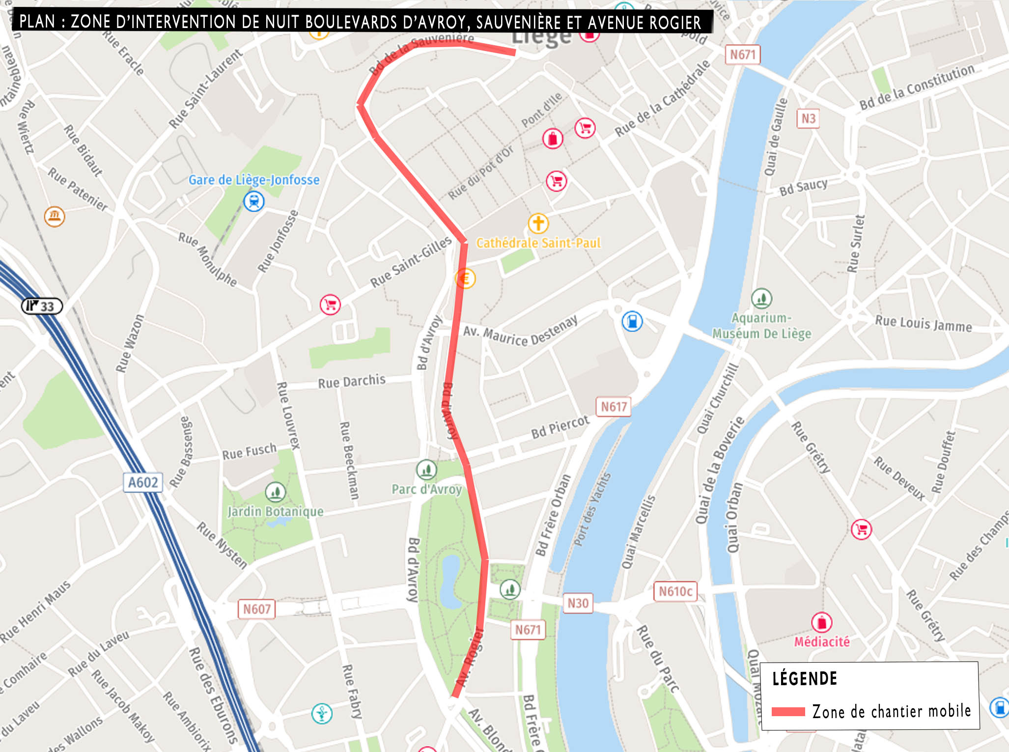 La zone de chantier s’étendra de l’avenue Rogier au boulevard de la Sauvenière inclus. Le chantier étant mobile, il aura un impact limité sur le trafic. Toutefois, l’inspection de certaines chambres de visite sur le boulevard de la Sauvenière pourrait entraîner des perturbations temporaires. Des agents de circulation seront présents pour assurer la fluidité de la circulation. Tout sera mis en œuvre pour réduire les nuisances sonores au maximum. (voir plan ci-dessous)