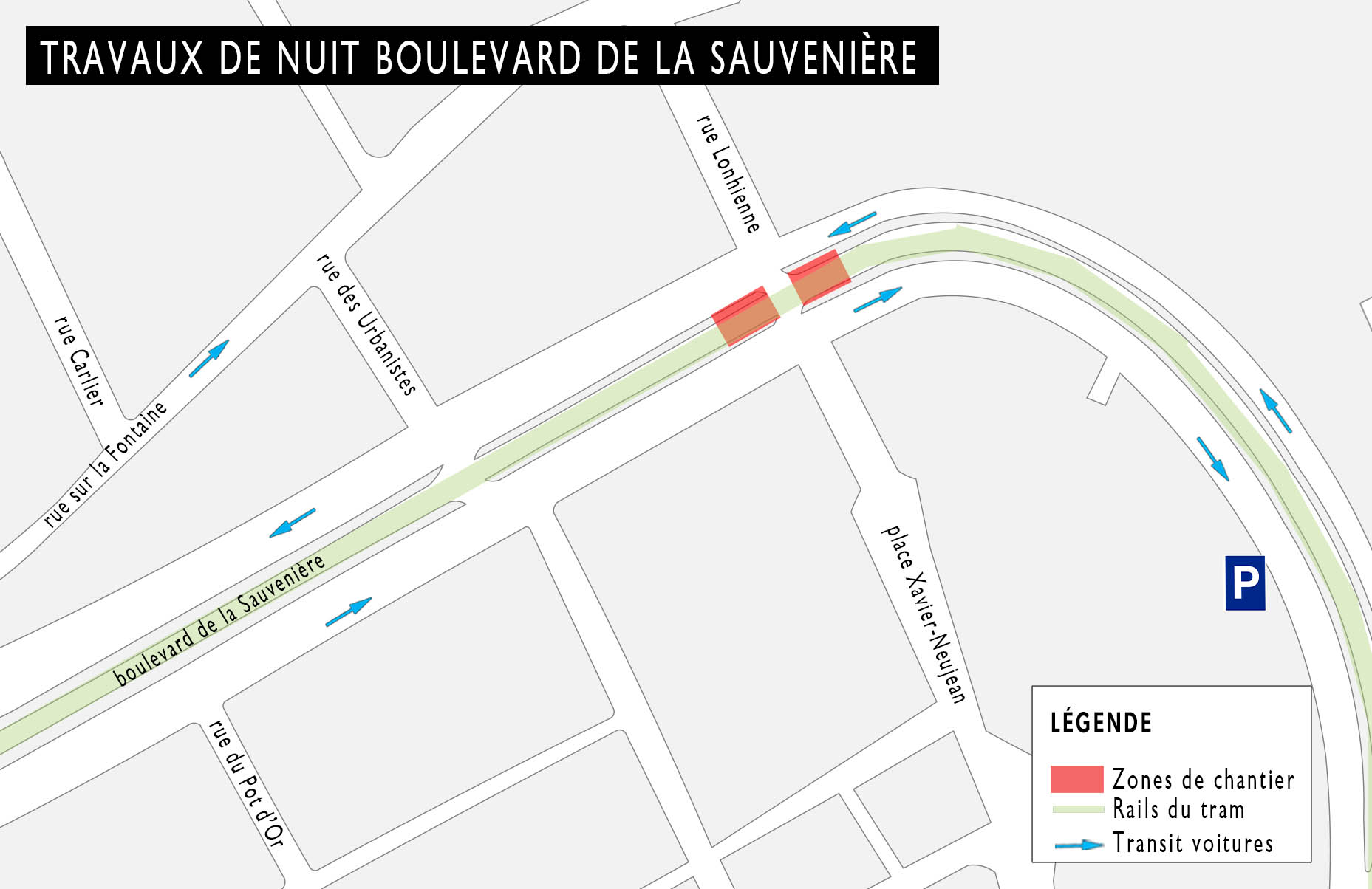 La réfection de certains éléments de la plateforme du tram sera réalisée sur le boulevard de la Sauvenière les nuits du MARDI 8 AVRIL au JEUDI 10 AVRIL 2025 de 22h à 6h.