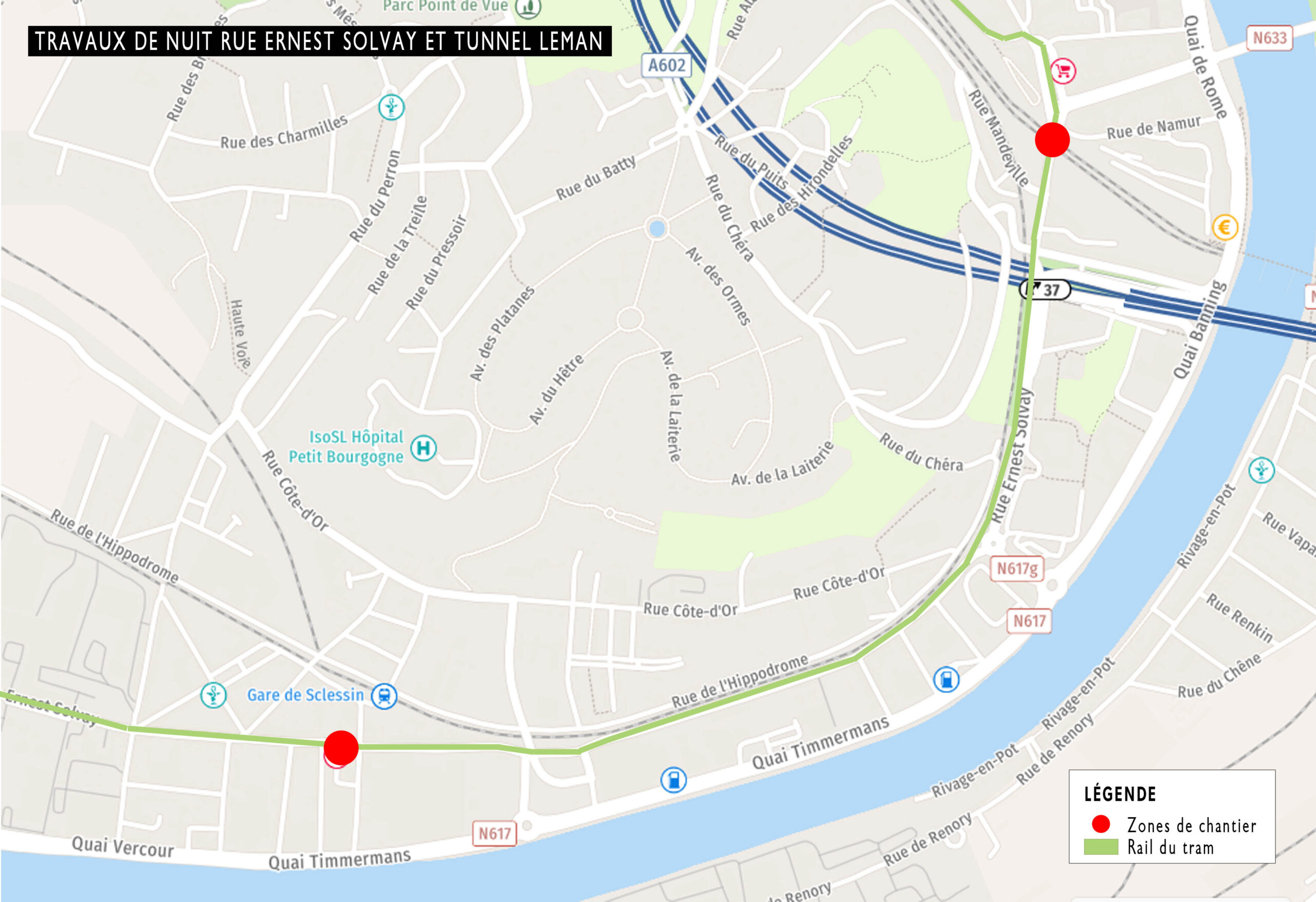 Les zones de chantier seront situées rue Ernest Solvay, au niveau du Lidl et au niveau du tunnel Leman. Ces travaux n’auront pas d’impact pour la circulation. Tout sera mis en œuvre pour réduire les nuisances sonores au maximum (voir plan ci-dessous)