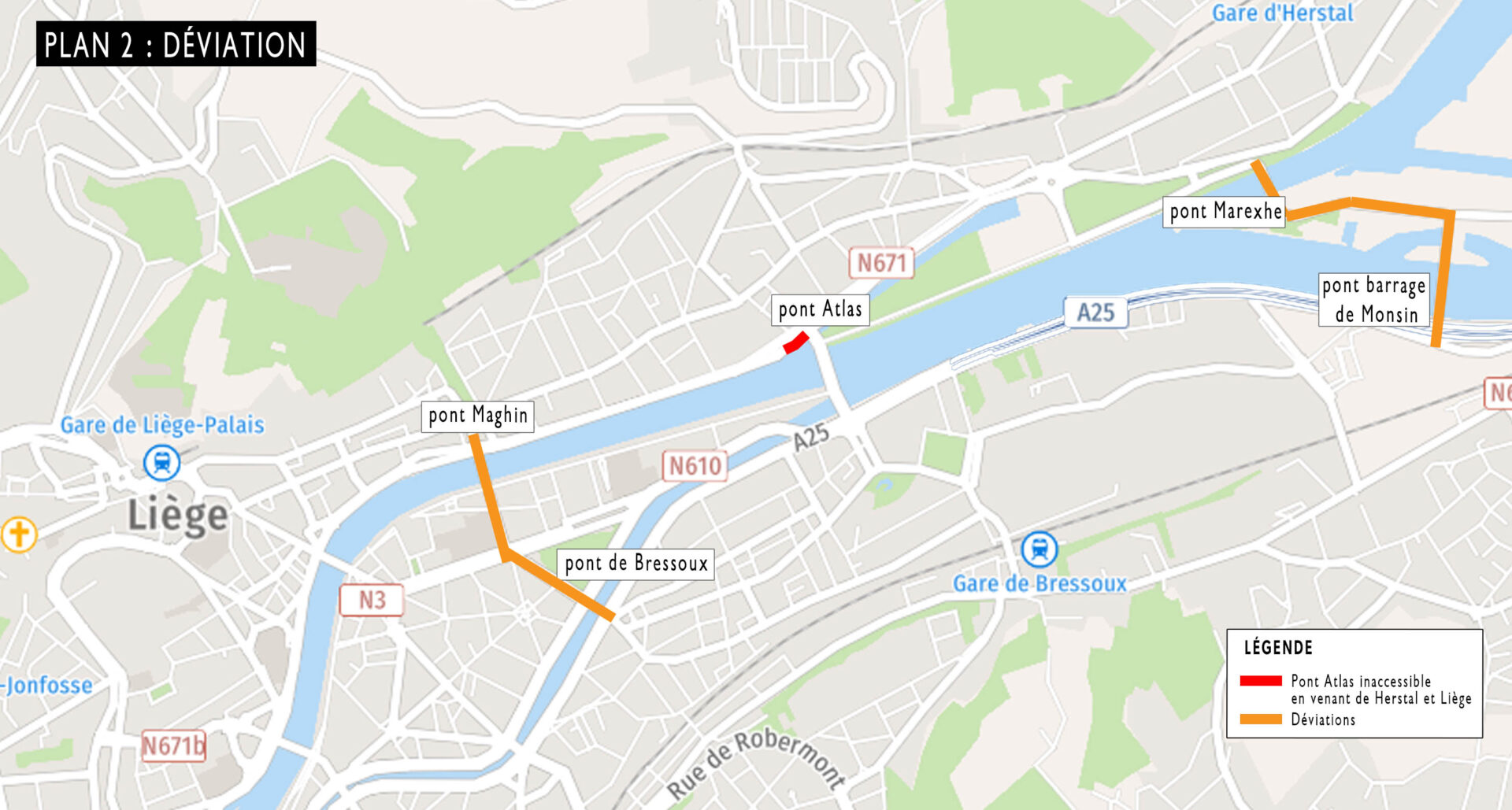 La zone de chantier sera située quai Saint-Léonard à hauteur du pont Atlas. La rampe du pont Atlas en venant de Herstal et de Liège ne sera temporairement plus accessible à la circulation. Des déviations seront temporairement mises en place via le pont Maghin et le pont de Bressoux ou via le pont Marexhe et le pont barrage de Monsin. (voir plans ci-dessous)