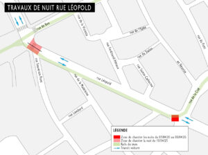 La nuit du LUNDI 7 AVRIL de 22h à 6h : La zone de chantier sera située rue Léopold, à hauteur de la rue de la Cité. Des hommes trafic seront présents pour gérer la circulation en plus des feux de signalisation. La nuit du JEUDI 10 AVRIL de 4h à 6h : La zone de chantier sera située au ^pied de la rue Léopold, du côté de la rue de Bex. Le marquage au sol du passage pour piétons sera réalisé en alternance afin de garantir la circulation. Tout sera mis en œuvre pour limiter les nuisances sonores. (voir plan ci-dessous)
