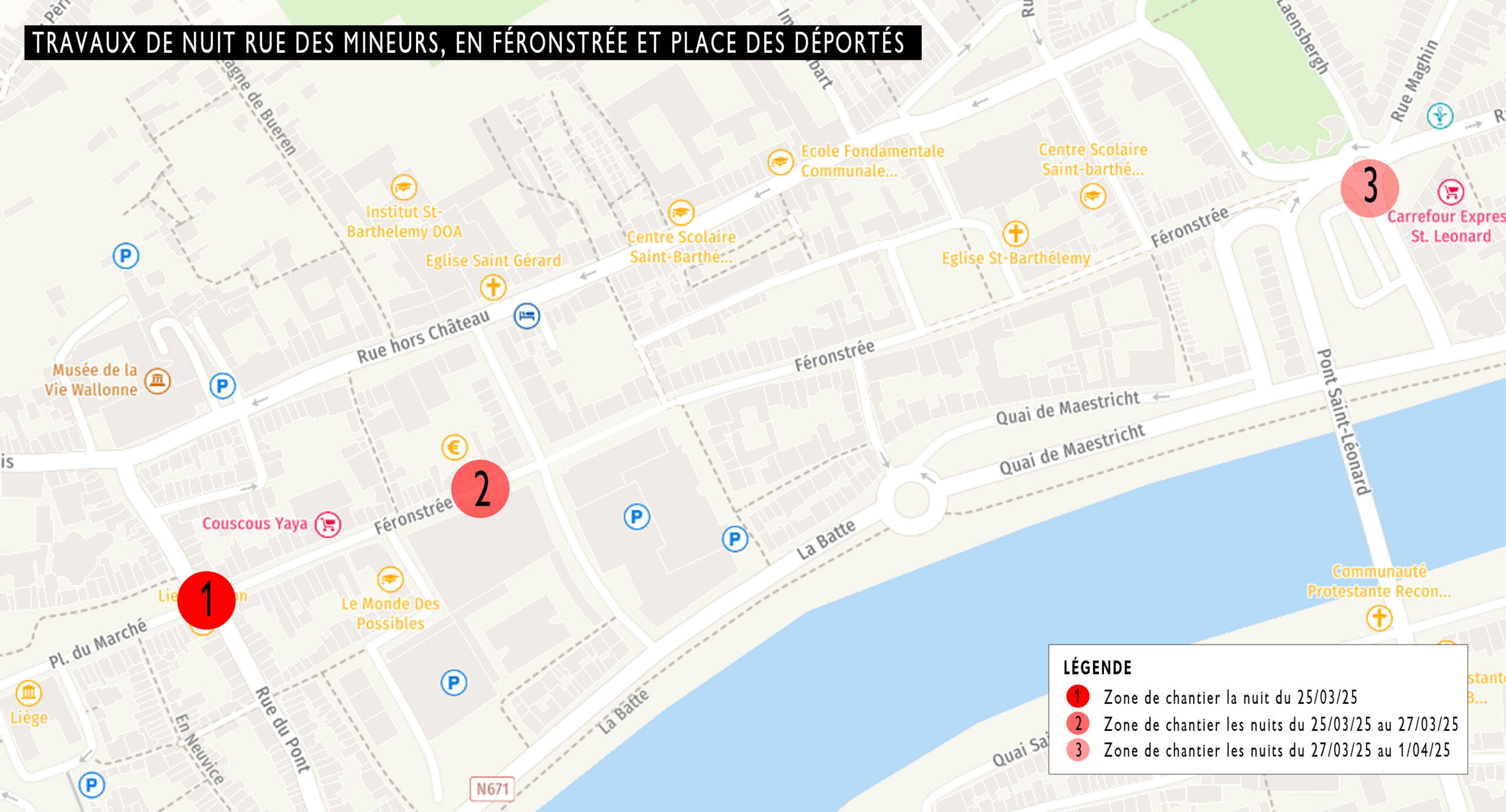 La réfection et la remise à niveau de certains éléments seront réalisées rue des Mineurs, en Féronstrée et place des Déportés les nuits du MARDI 25 MARS au MARDI 1er AVRIL 2025 de 22h à 4h20.